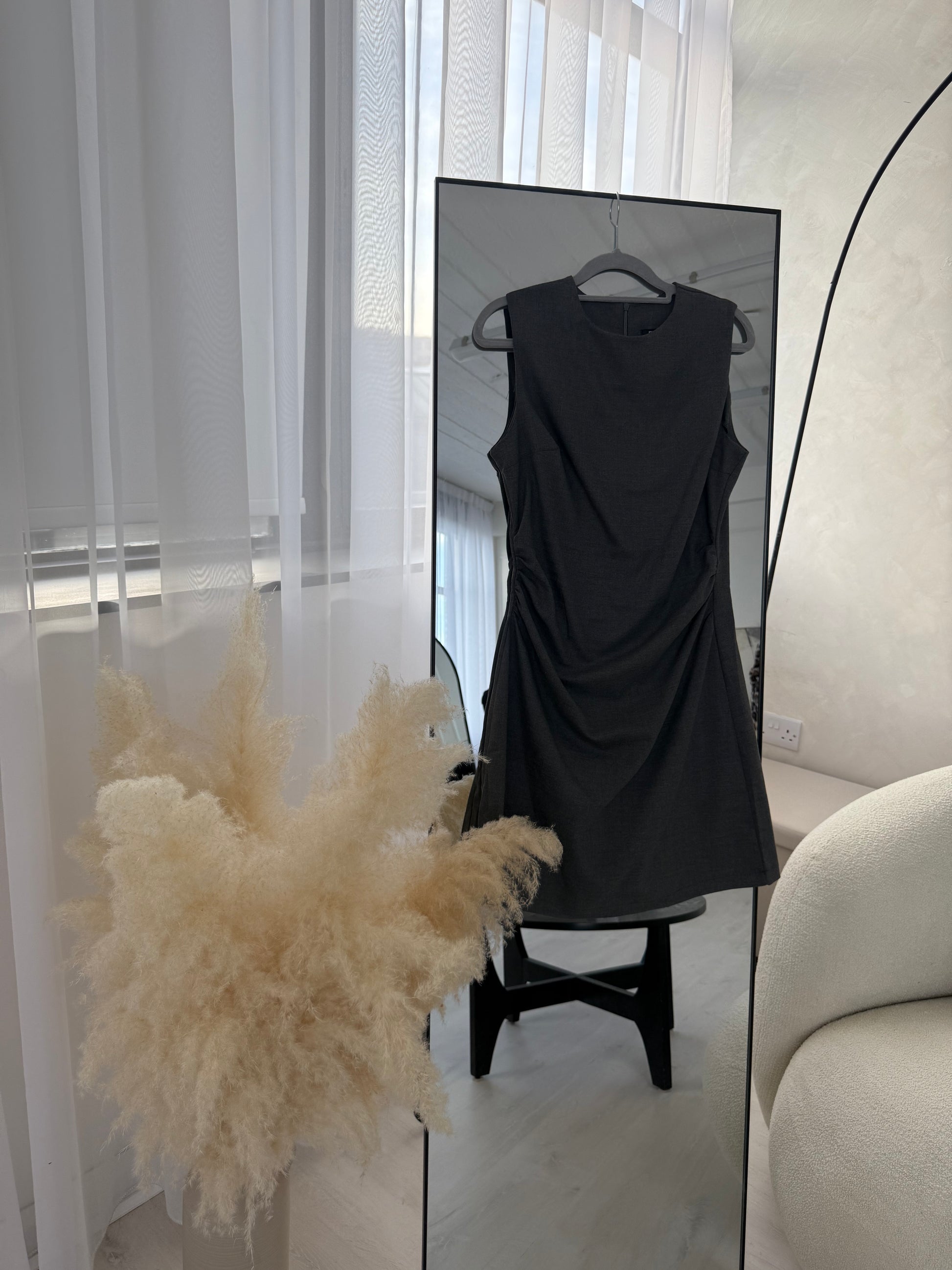 Dress to impress with this short grey dress! The side gathering adds a touch of formality while still maintaining a demure look. Perfect for any occasion.