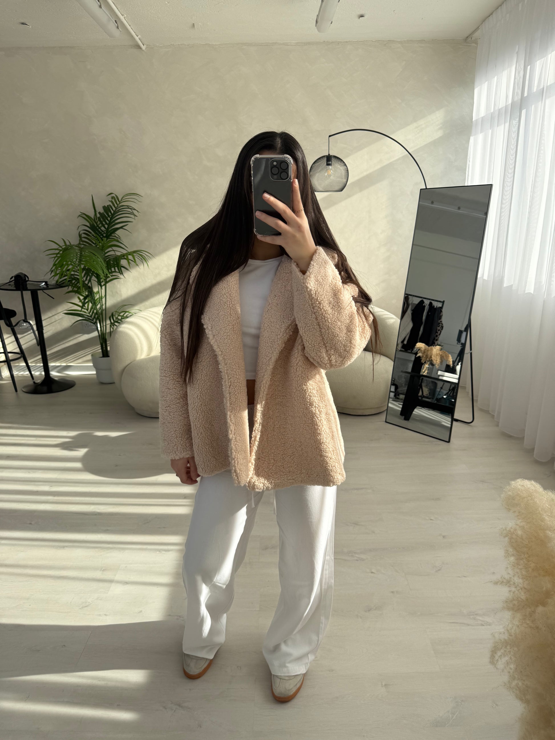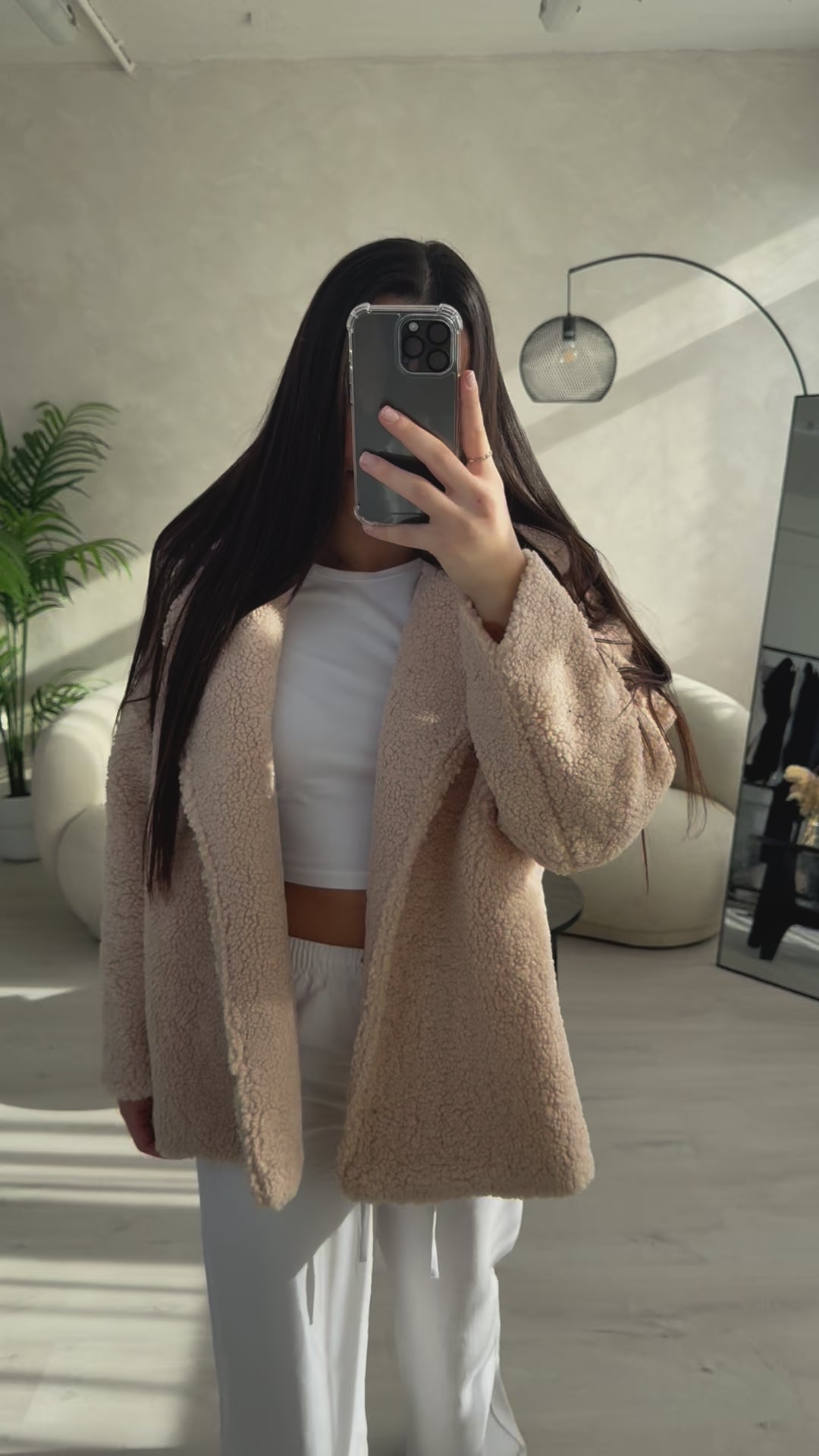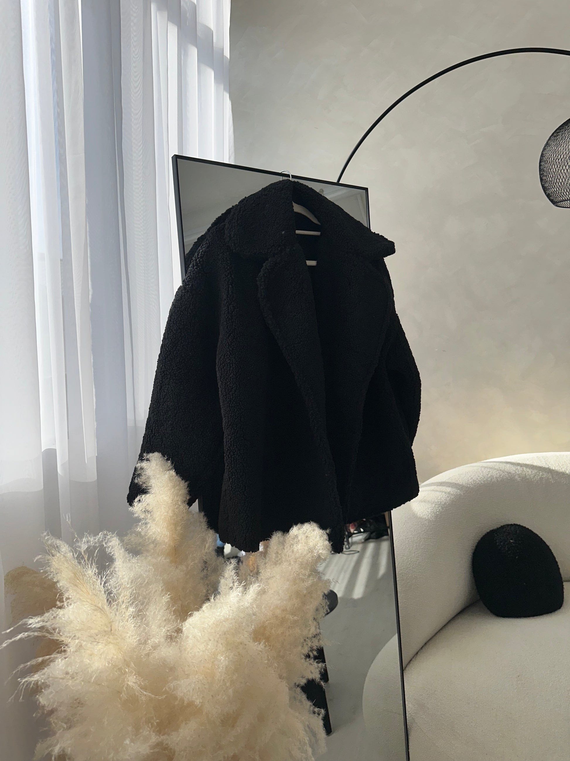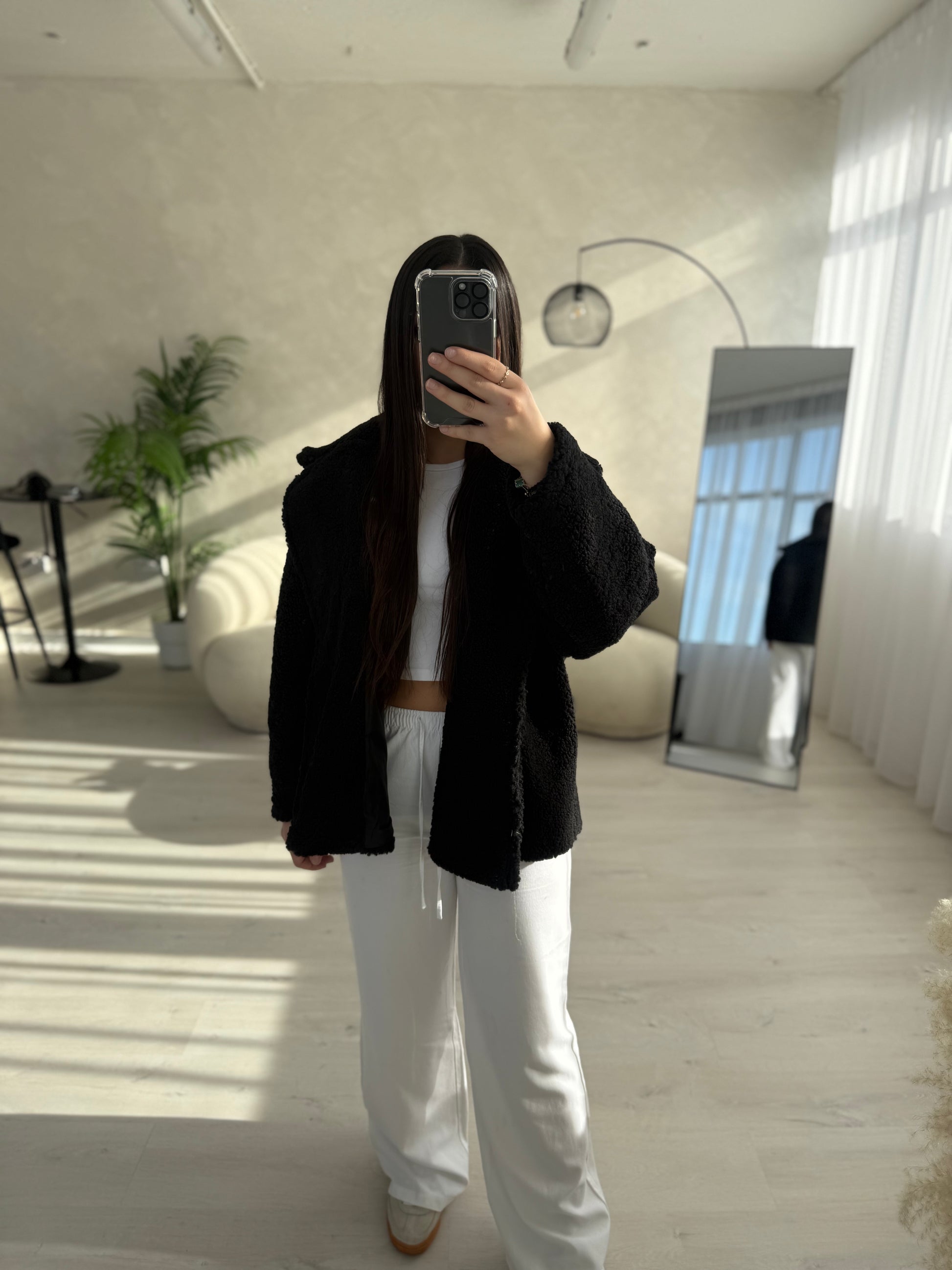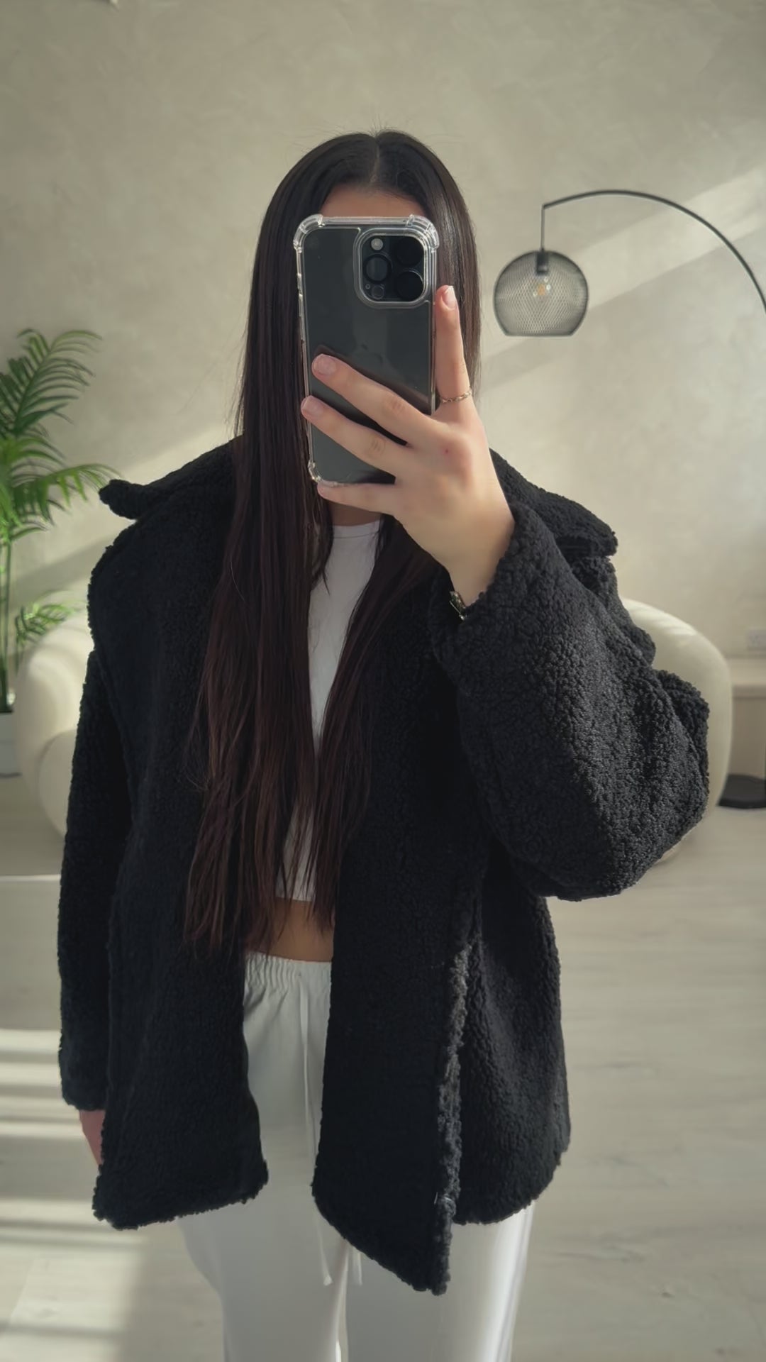 Get cozy in our trendy teddy jacket in classic black. Perfect for any occasion, this jacket will keep you warm and stylish. With its soft fabric and playful design, Don't miss out on this must-have piece. (P.S. It's also great for bear hugs!)