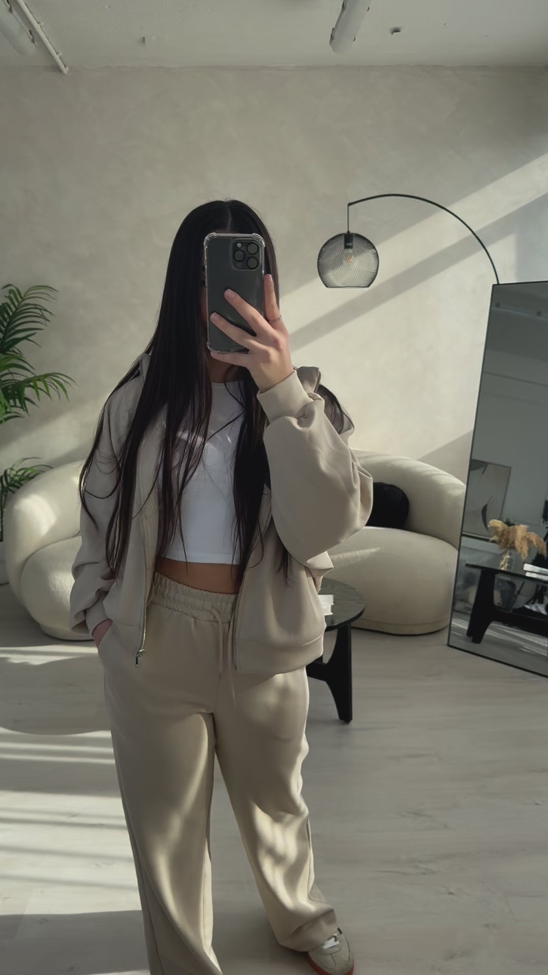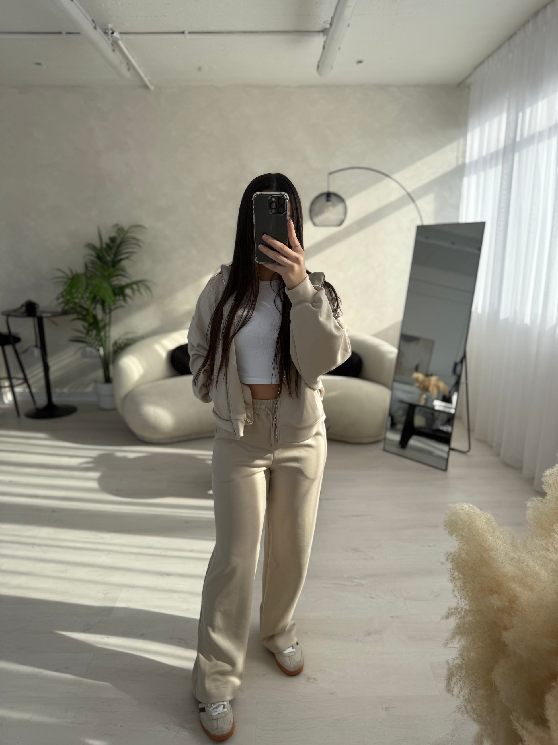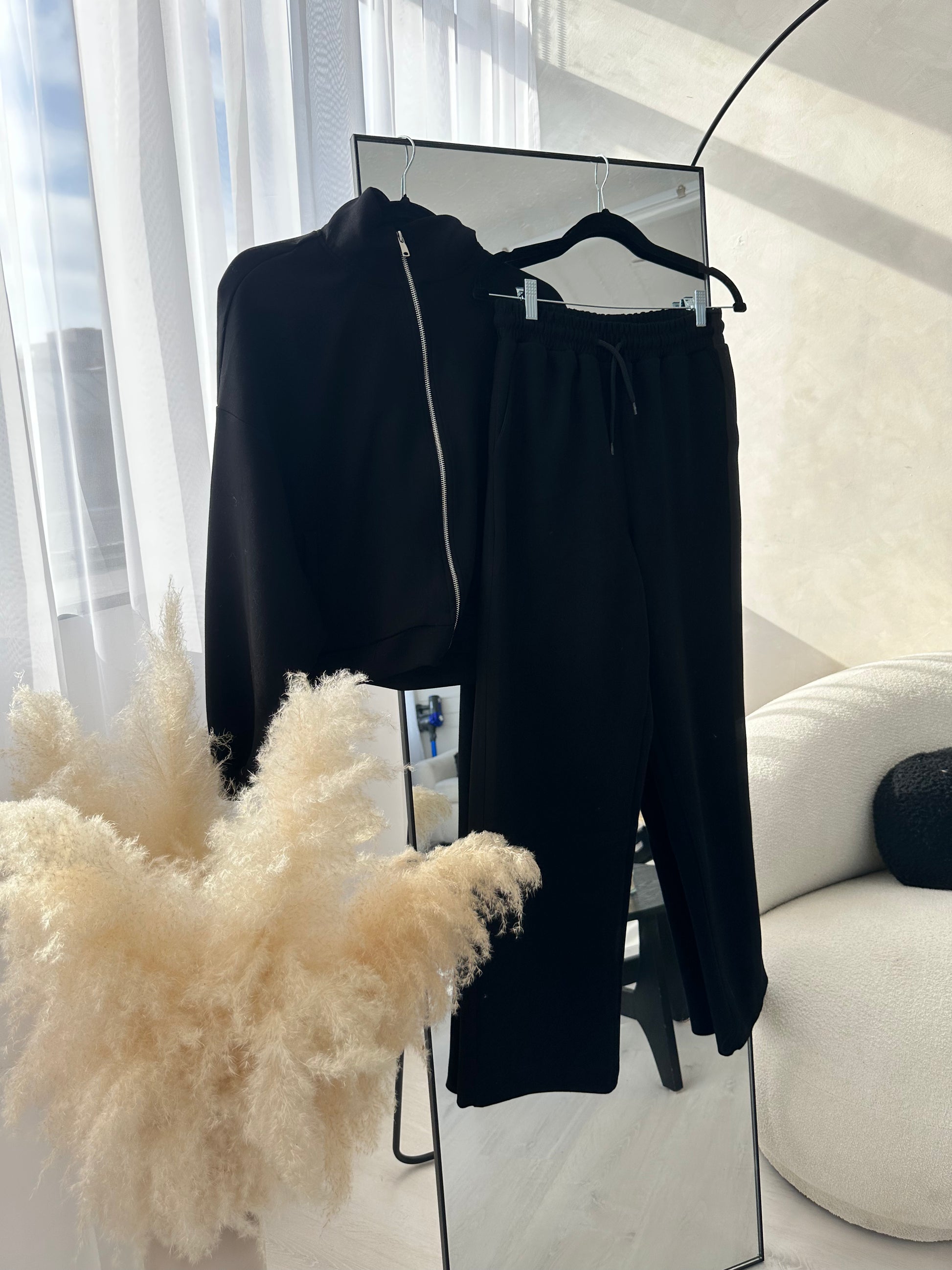 Get ready to lounge in style and comfort with our Tracksuit Set! Made with ultra soft fabric, this set includes a jacket and bottoms. The bottoms feature convenient side and back pockets, while the jacket also boasts side pockets. Available in black and beige. (No more sacrificing style for comfort!)